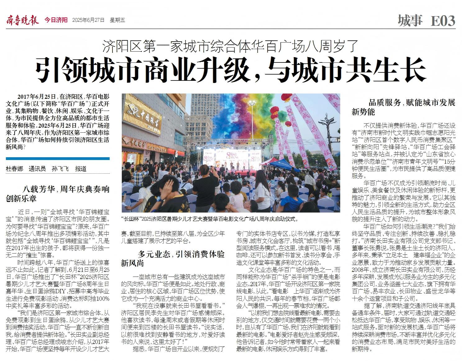 2017年6月25日,在濟陽區,華百電影文化廣場(以下簡稱“華百廣場”)正式開業,其集購物、餐飲、休閑、娛樂、文化于一體,為市民提供全方位高品質的都市生活服務和體驗。2025年6月25日,華百廣場迎來了八周年慶。作為濟陽區第一家城市綜合體,華百廣場如何持續引領濟陽區生活新風尚?