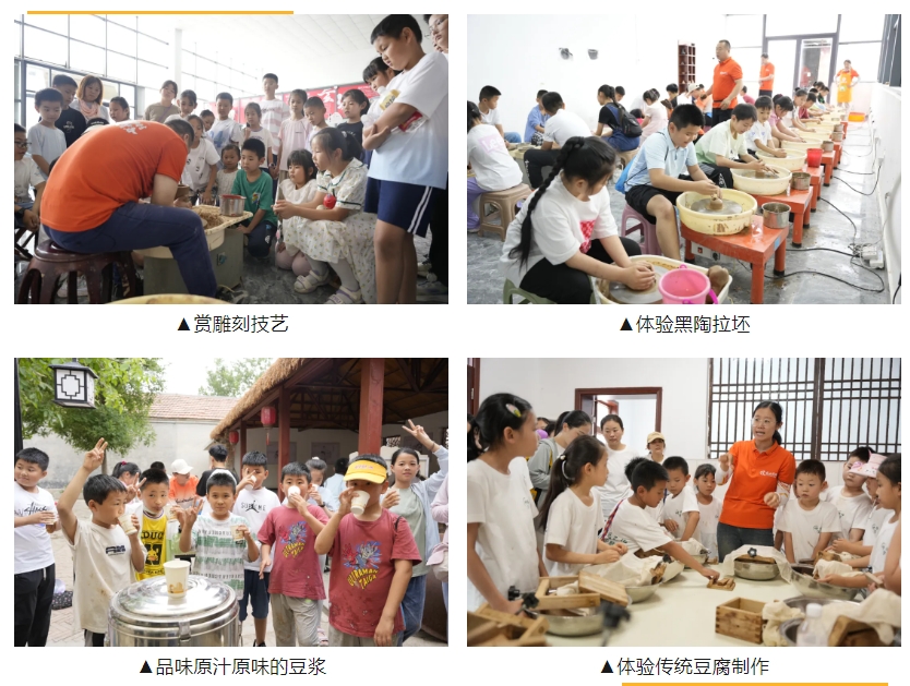 在課程研發中,基地主導打造“陶藝匠心”“非遺工坊”等特色項目,將濟陽黑陶制作、傳統手工藝等非遺技藝融入教學,讓傳統文化“可觸摸、可參與”。例如,在“陶藝匠心”課程中,學生可觀生產工藝、賞雕刻技藝和拉坯表演,更能親手制作黑陶器皿,感受黃河流域陶藝文化的千年底蘊;“古法豆腐”研學課程中,深入挖掘傳統豆腐制作工藝,讓學生親手參與從選豆、泡豆、磨漿、煮漿到點鹵、壓模的全過程,在實踐中體會傳統工藝的魅力。