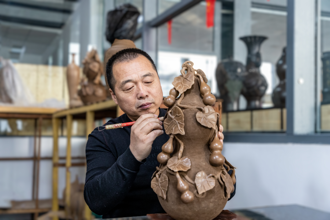 黑陶是華夏先民的黑色詩篇,作為土生土長的濟(jì)陽人,三十余載光陰里,徐慶增潛心研究黑陶,續(xù)寫這光輝的詩篇。如今,他的作品早已超越實(shí)用范疇,成為兼具藝術(shù)價值與文化厚度的非遺名片。《龍騰盛世》以華夏龍為魂,將泥與火的淬煉推向極致。《福壽葫蘆》造型圓潤飽滿,釉色沉郁如墨玉,無需多言,一抹玄色間,福氣已悄然落定。《鼓子秧歌》則將田間地頭的歡騰瞬間凝固于陶面,讓人仿佛聽見咚咚的鼓點(diǎn),看見祖輩們在黃河邊舞出的煙火人間。這些凝聚著心血的創(chuàng)作,不僅是他個人的藝術(shù)成就,更成為高校非遺教學(xué)中鮮活的教材。